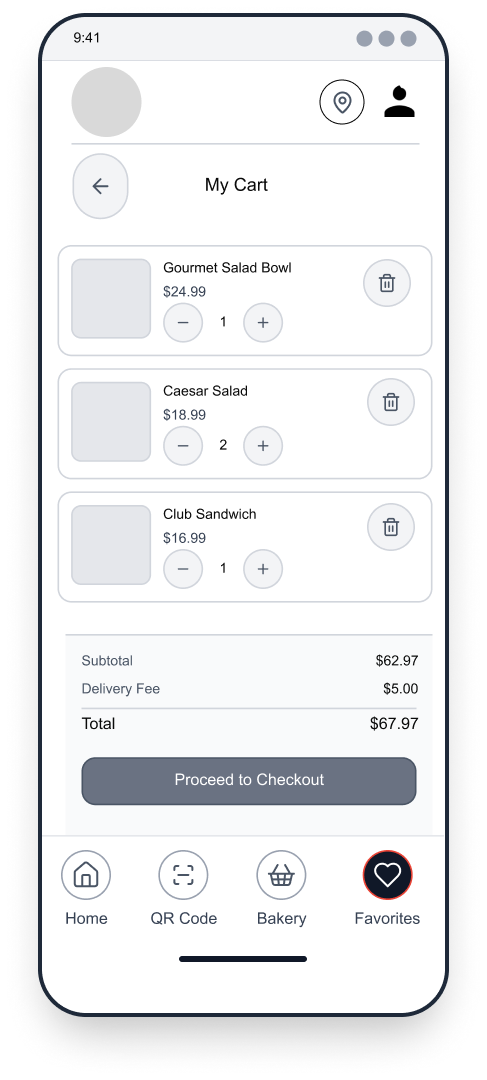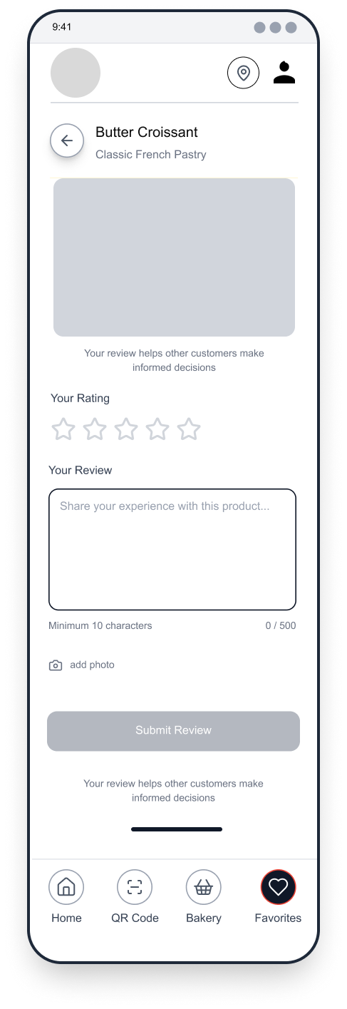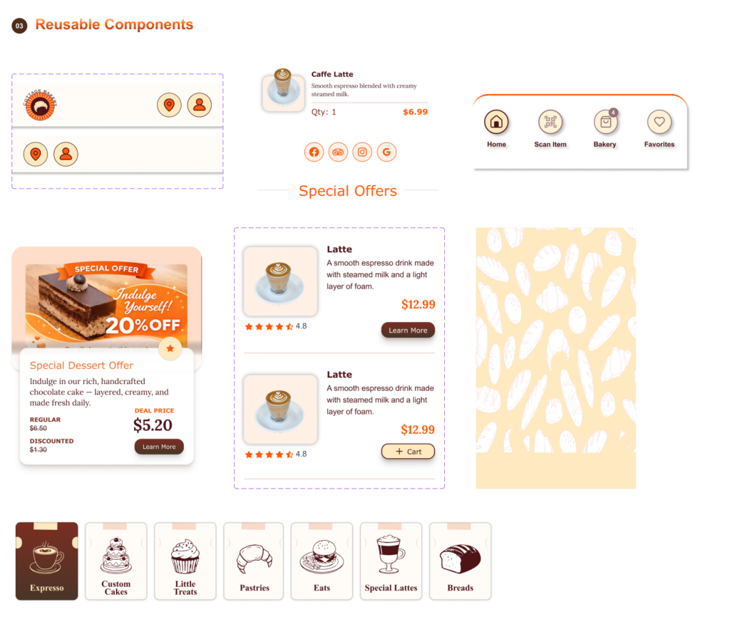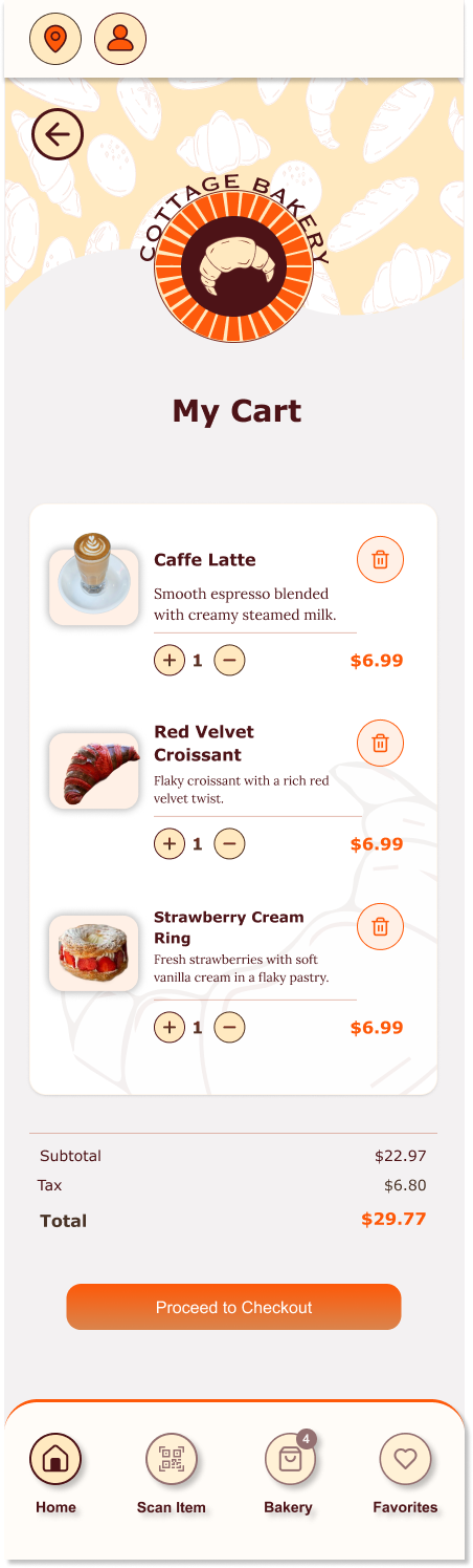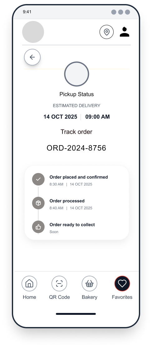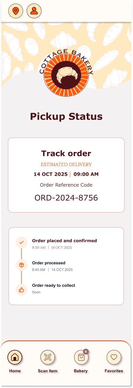 To reduce congestion and improve service flow, the app would allow customers to place advanced takeout orders, select pickup times, and avoid long wait periods inside the bakery. Integrated stock management features would notify users when certain items are sold out, helping set accurate expectations and preventing disappointment.