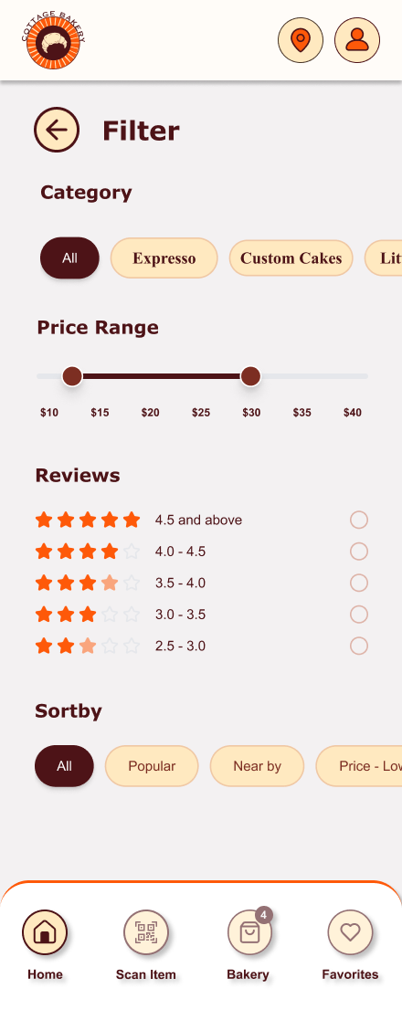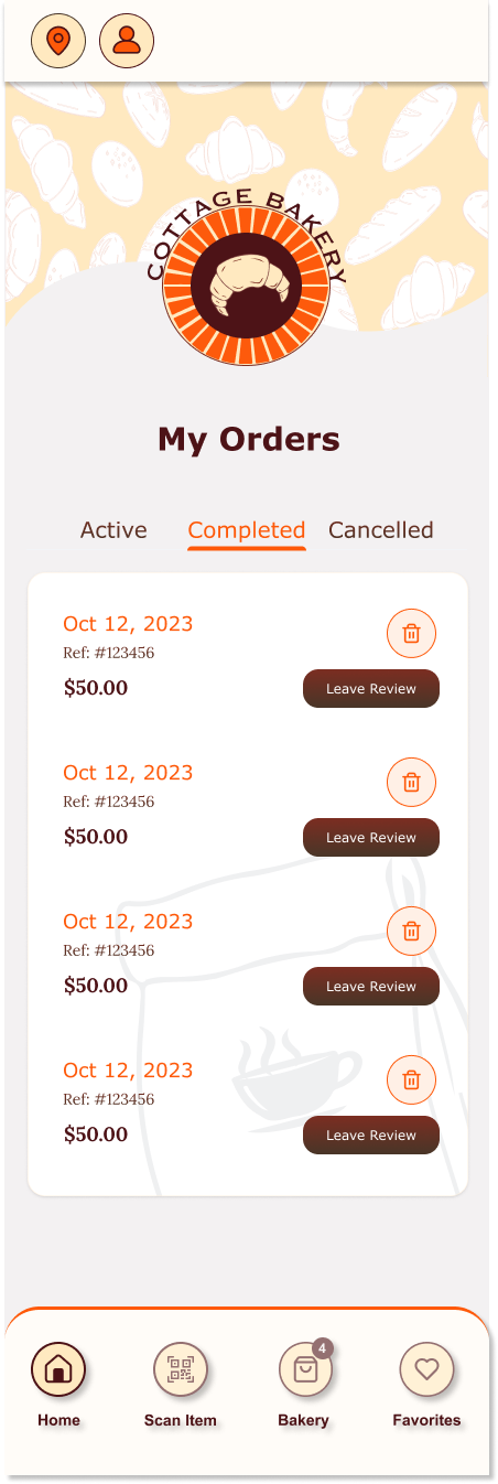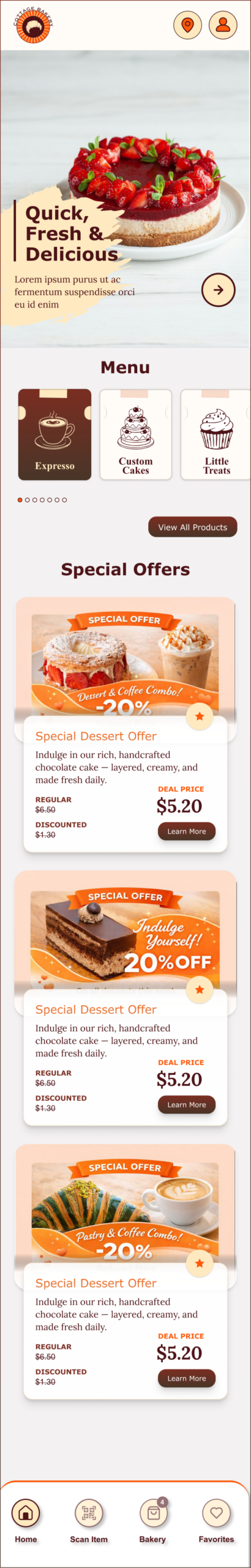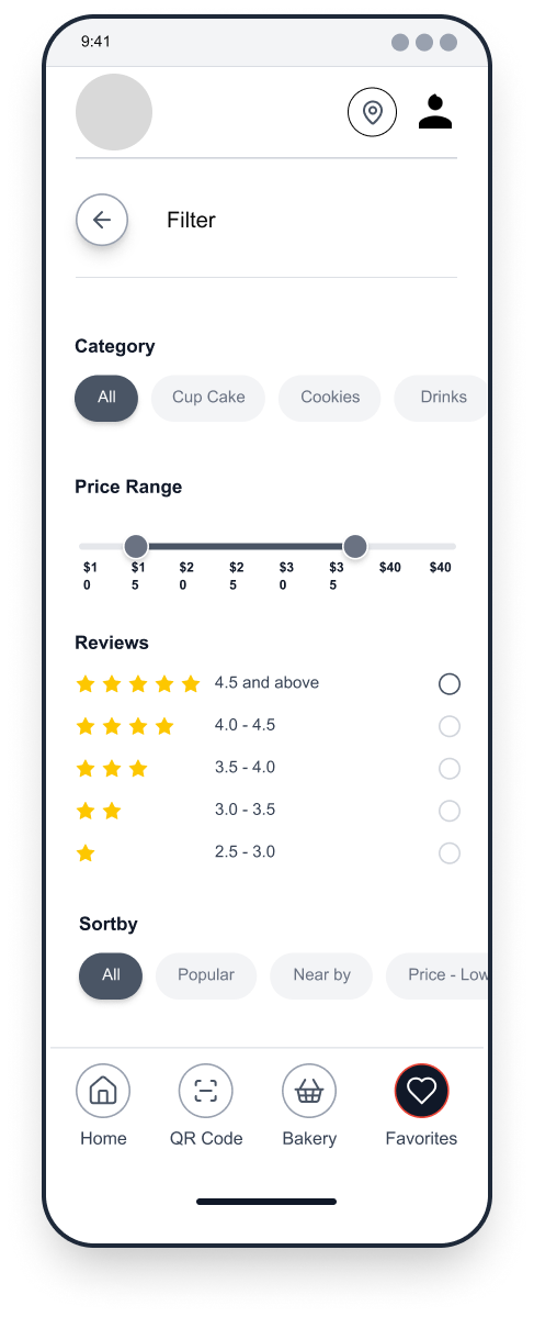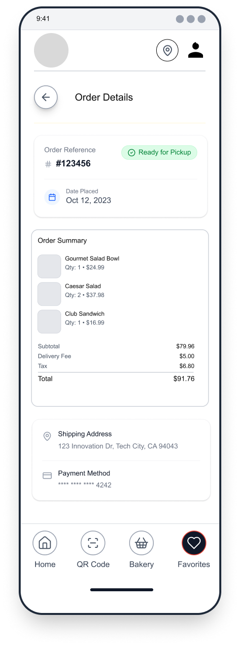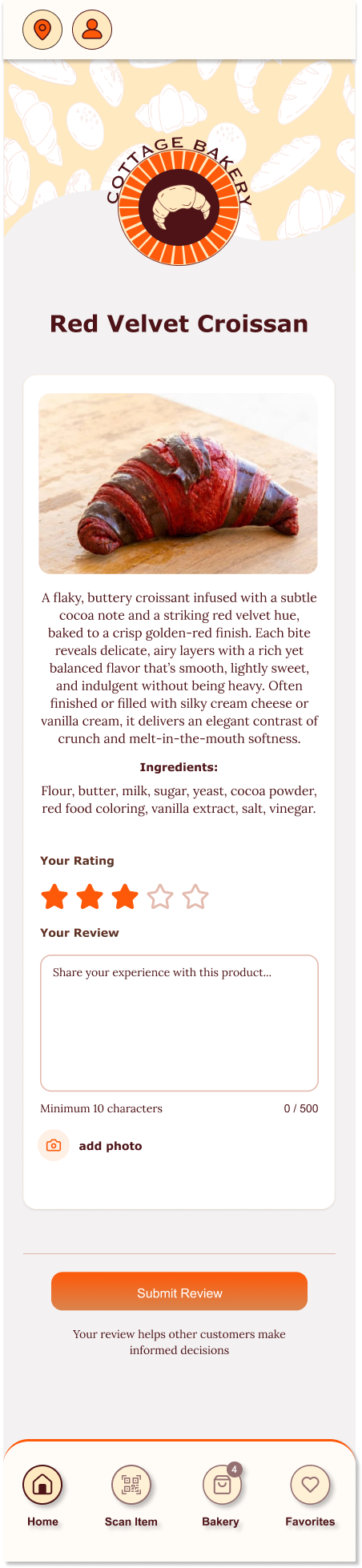 To reduce congestion and improve service flow, the app would allow customers to place advanced takeout orders, select pickup times, and avoid long wait periods inside the bakery. Integrated stock management features would notify users when certain items are sold out, helping set accurate expectations and preventing disappointment.