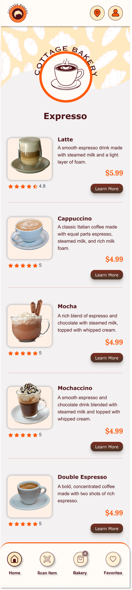 This project focuses on designing a mobile app that improves menu accessibility, streamlines ordering, and enhances overall customer experience. The goal was to create a user-centered digital solution that reduces wait times, increases transparency, and supports more efficient bakery operations.
